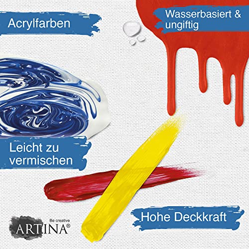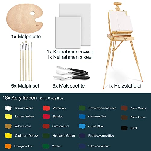 Artina 30tlg Staffelei Set Madrid - Kofferstaffelei mit XXL Acryl Leinwand Malset - Feldstaffelei mit 90ยฐ Neigung - Holzstaffelei Malset mit 18 Acrylfarben, 2 Keilrahmen, Pinseln und Malspachteln๐ฏ๐ฌ๐ง๐๐ ๐ฆ๐ง๐๐๐๐๐๐๐ ๐ ๐๐๐ฆ๐๐ง โ Das Acryl und Staffelei Set Madrid von Artina enthรคlt 1x Kofferstaffelei aus Kiefernholz, 18x Acrylfarben, 1x Mischpalette, 1x 5er Pinselset, 2x Leinwรคnde und 3x Malspachtel."๐ง๐ฅ๐๐ก๐ฆ๐ฃ๐ข๐ฅ๐ง๐๐๐๐ ๐๐ข๐๐๐๐ฅ๐ฆ๐ง๐๐๐๐๐๐๐ โ Die Feldstaffelei kann problemlos zur Koffer Tischstaffelei umfunktioniert werden. Durch ihre kompakte Form ist der Kรผnstlerkoffer sehr gut fรผr den Transport geeignet und kann bei Nichtbenutzung platzsparend verstaut werden."๐ฆ๐ง๐๐๐๐๐๐๐ ๐ ๐๐ง ๐ฉ๐๐ฅ๐ฆ๐ง๐๐๐๐๐๐ฅ๐๐ ๐ก๐๐๐๐จ๐ก๐๐ฆ๐ช๐๐ก๐๐๐ โ Die Holzstaffelei kann mit wenigen Handgriffen in eine 90ยฐNeigung eingestellt werden. Die Artina Staffelei kann dank Ihren vielseitigen Einstellungen, fรผr fast alle Maltechniken verwendet werden."๐ฆ๐๐ง ๐๐ก๐๐ ๐ฎ ๐๐๐๐๐ฅ๐๐๐ ๐๐ก โ Die Keilrahmen haben die Grรถรen 24 x 30 cm und 30 x 40 cm. Die verstellbare Standstaffelei aus Kiefer Holz ist auch fรผr Leinwรคnde bis zu einer Hรถhe von 100cm geeignet."๐ร๐ฅ ๐๐ก๐ร๐ก๐๐๐ฅ, ๐๐ข๐๐๐ฌ๐ ๐๐๐๐ฅ & ๐ฃ๐ฅ๐ข๐๐๐ฆ โ Das Malset von Artina ist perfekt geeignet als Geschenk, fรผr den Start in die Malerei, fรผr Anfรคnger oder fรผr Hobbykรผnstler. Das Malset mit Staffelei, Acrylfarben, Pinseln und weiteren Malutensilien, bietet Ihnen den optimalen Umfang an Materialien zum Malen.