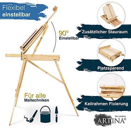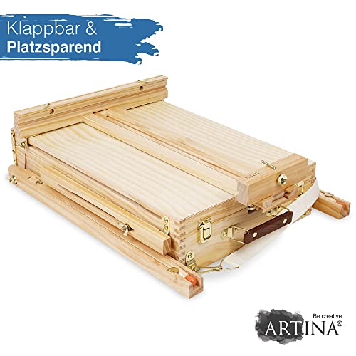 Staffeleien Artina 30tlg Staffelei Set Madrid - Kofferstaffelei mit XXL Acryl Leinwand Malset - Feldstaffelei mit 90ยฐ Neigung - Holzstaffelei Malset mit 18 Acrylfarben, 2 Keilrahmen, Pinseln und Malspachteln