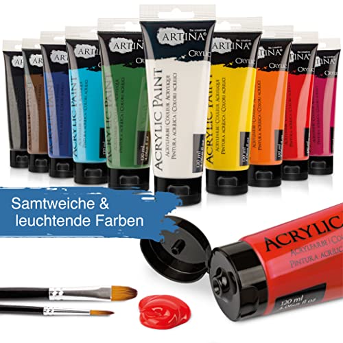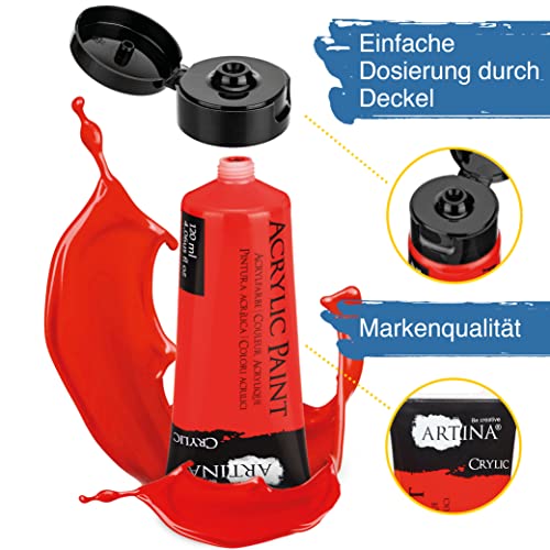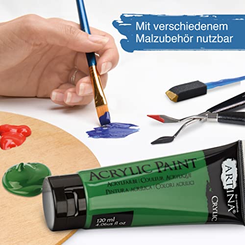 Artina Crylic 10 x 120ml Acrylfarben Set - 10 Farben hochwertige Künstlerfarben Acryl Farben Set - Acrylfarbe für Hobby-Künstler & Profis, Malfarbe für Leinwand, Holz, Steine etc.