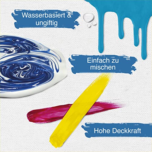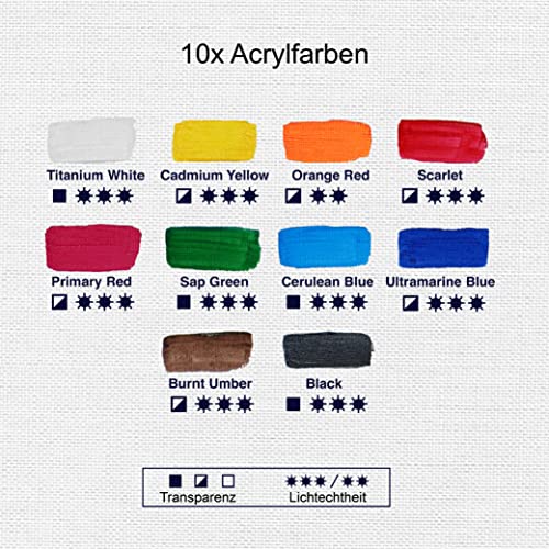 𝗪𝗔𝗦𝗦𝗘𝗥𝗕𝗔𝗦𝗜𝗘𝗥𝗧𝗘 𝗔𝗖𝗥𝗬𝗟𝗙𝗔𝗥𝗕𝗘𝗡 𝗦𝗘𝗧 𝟭𝟮𝟬𝗺𝗹 – Dieses Farben Set bietet Ihnen 10 x 120ml Grundfarben für die Acrylmalerei. Die Acyrlfarbe besteht auf Wasserbasis und kann bestens miteinander vermischt werden, um verschiedene Farbtöne zu kreieren."𝗛𝗢𝗛𝗘 𝗣𝗜𝗚𝗠𝗘𝗡𝗧𝗜𝗘𝗥𝗨𝗡𝗚 – Unsere Acrylfarben zum Malen verfügen über eine hohe Pigmentierung, so bleiben Ihre Kunstwerke besonders lange bunt und strahlend. Mit ihrer samtweichen Konsistenz lässt sich die Bastelfarbe prima verarbeiten."𝗦𝗖𝗛𝗡𝗘𝗟𝗟𝗧𝗥𝗢𝗖𝗞𝗡𝗘𝗡𝗗 & 𝗪𝗔𝗦𝗦𝗘𝗥𝗙𝗘𝗦𝗧 – Die Malfarben sind äußerst schnelltrocknend nach dem Auftragen. Nach dem Trocknen bilden die Acryl Farben einen elastischen Film und bleiben permanent wasserfest."𝗛𝗢𝗛𝗘 𝗗𝗘𝗖𝗞𝗞𝗥𝗔𝗙𝗧 & 𝗙𝗔𝗥𝗕𝗕𝗥𝗜𝗟𝗟𝗜𝗔𝗡𝗭 – Die Farben vom Acryl Malset zeichnen sich durch eine besonders hohe Deckkraft, sowie einer guten Lichtechtheit aus. Die Farben für die Leinwand besitzen eine äußerst hohe Farbbrillianz für besonders aussdrucksstarke Kunst."𝗩𝗘𝗥𝗗Ü𝗡𝗡𝗕𝗔𝗥 & 𝗩𝗘𝗥𝗦𝗖𝗛. 𝗠𝗔𝗟𝗧𝗘𝗖𝗛𝗡𝗜𝗞𝗘𝗡 – Die Malfarben Acryl sind mit Wasser oder mit speziellen Acrylmalmitteln verdünnbar. Zudem können die Farben sowohl Nass-in-Nass, Pastos, als auch lasierend aufgetragen werden. Zusätzlich kann das Acrylfarbenset für Acrylic Pouring, Fluid Painting, Acryl Fließtechnik oder Fluid Art verwendet werden.