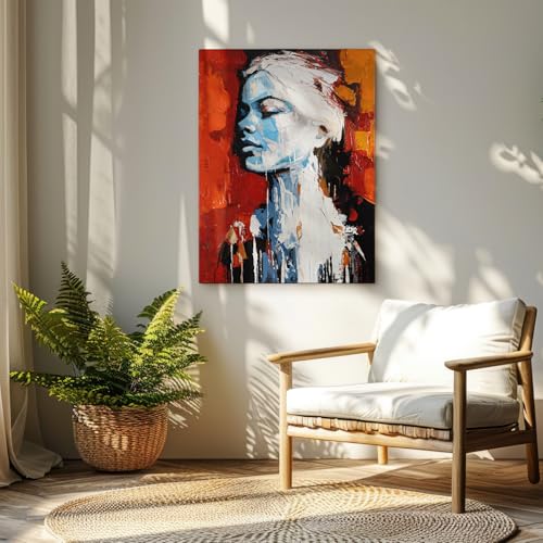 - Jedes Werk ist ein Unikat – leichte Abweichungen machen es einzigartig. Abstraktes Frauenportrait in Schwarz, Weiß, Rot und Orange – mit Strukturpaste entsteht ein stilles, kraftvolles Bildmoment zwischen Traum, Stärke und Zurückgezogenheit.
