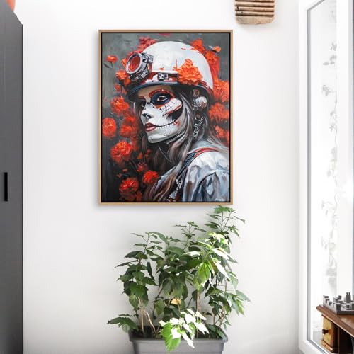 - Einzigartiges, handgemaltes Acrylgemälde auf Leinwand – „Blüte der Schattenkriegerin“ zeigt ein Frauenportrait mit Helm und roten Blüten. Ausdrucksstark, symbolisch und voller Spannung zwischen Stärke und Vergänglichkeit.
