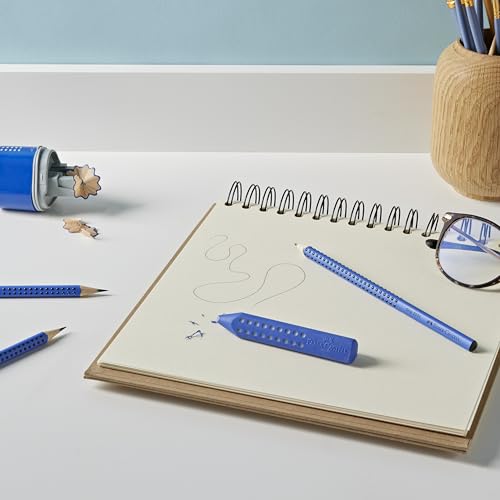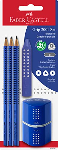 FABER-CASTELL 580023 - Bleistifte Set Grip 2001, 5-teilig mit 3 Bleistiften, Radiergummi und Spitzer, blauDas Schreibset Grip 2001 enthält drei Bleistifte, einen Radierer und einen Spitzer. Alle Schreibgeräte sind in der Farbe Blau"Die Bleistifte haben den Härtegrad B und eine ergonomische Dreikantform für ermüdungsfreies Schreiben"Mit der patentierten Grip-Zone wird das Abrutschen der Finger verhindert"Der Anspitzer mit Behälter ist passend für Standard sowie Jumbo Blei- und Buntstifte mit den Schaftformen Rund, Sechskant und Dreikant"Mit dem PVC freien Radiergummi in ergonomischer Dreikantform ist ein schmierfreies Radieren möglich