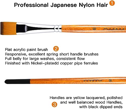Fuumuui Pinsel Set Malen - 6 Stück Professionell Künstlerpinselset Synthetisches Japanisches Nylon für Aquarell, Acryl, Ölgemälde, Gouache | Aquarell Pinsel, pinselset acrylfarben | Flach Pinsel Set- Hohe Qualität und langlebig - Die synthetischen Nylonhaare sind weich, dick, duktil und flexibel und federn nach jedem Pinselstrich perfekt zurück. Der hochwertige Bürstenkopf mit starker Saugfähigkeit und hervorragender Farbbeständigkeit bietet Ihnen ein besseres und gleichmäßigeres Malerlebnis. Pinsel einfach nach Gebrauch mit warmem Wasser reinigen und Pinselspitze neu formen."