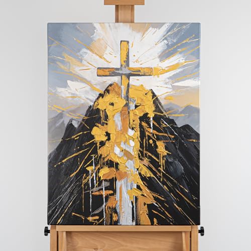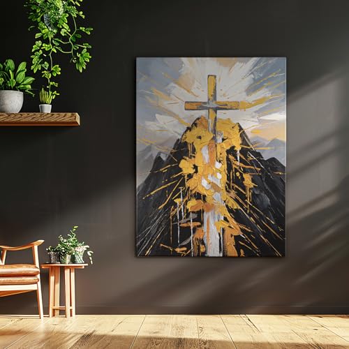 handgemalte Gemälde wunderschönes handgemaltes abstraktes Acrylgemälde goldenes Kreuz, auf Leinwand Berg der Vergebung 90x120 für Wohnräume, Büros, Foyers
