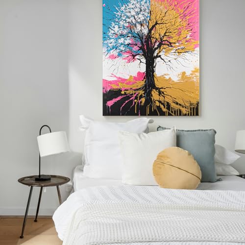 - Farbintensives Motiv mit Petrol, Pink und Gold – der kraftvolle Baum steht als Symbol für innere Stärke und Wandel, mit strukturierter Oberfläche auf 4 cm starkem Keilrahmen eindrucksvoll in Szene gesetzt.
