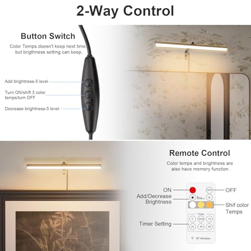 - 2-TYP-STEUERUNG: Plug in Bild Licht hat 2-Wege, um die Leuchte zu schalten: EIN/AUS-Schalter in der Leitung und Fernbedienung. Die Fernbedienung ermöglicht es Ihnen, das Bild Licht jederzeit und überall innerhalb der zulässigen Reichweite zu steuern, während die Fernbedienung hat eine Timer-Funktion, die Sie einen Timer zum Ausschalten von Kunst Licht setzen können