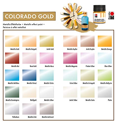Marabu 12640005784 - Metallic Effektfarbe, Colorado Gold metallic gold 50 ml, auf Wasserbasis, lichtecht, wetterfest, schnell trocknend, zum Pinseln und Tupfen auf saugenden UntergründenSeidenglänzende, metallisch-schimmernde Metallic-Effektfarbe"Ergiebig, intensive Farbtiefe"Geeignet für saugende Untergründe wie Holz, MDF, Pappmaché, Papier, Stein, Kermik, Ton, Leinwand, u.a."Zum Pinseln und Tupfen"Wetter- und wischfest, wasserbasiert