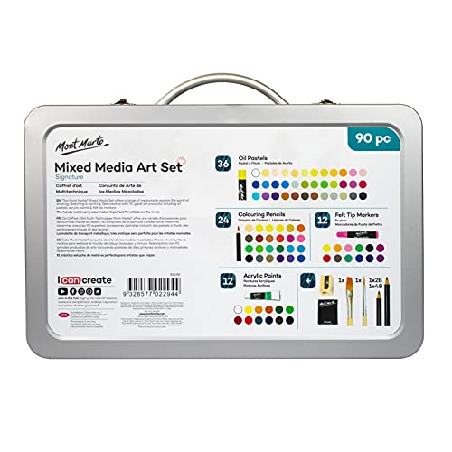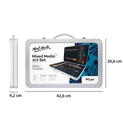 Mont Marte Premium Malset – 90-teilig – Hochwertiger Malkoffer aus Aluminium mit essentiellen Malmedien – Acryl-, Ölpastellfarben, Stifte, Pinsel und vieles mehrERLESENE AUSWAHL - 90-teiliges Premium Malset von MONT MARTE als kreatives Sprungbrett für den eigenen künstlerischen Einsatz. Sämtliches wichtiges Equipment ist in der exklusiven Sammlung bereits mit inbegriffen. Die perfekte Geschenkidee für Künstlerinnen und Künstler und solche, die es werden wollen."HOCHWERTIGER INHALT - Der exquisite Künstlerkoffer enthält professionelle Acrylfarben, Ölpastelle, kraftvolle Faserstifte sowie langlebige Buntstifte für wahre Farbexplosionen auf Papier oder Leinwand. Je eine Rund- und Flachbürste, ein Anspitzer, zwei Bleistifte in verschiedenen Härtegraden und ein Radiergummi garantieren das Gelingen perfekter Bilder und Skizzen."BEQUEMES MALEN - Beim Malen oder Zeichnen ganz in seiner Kreativität aufzugehen ist dank der übersichtlichen Fächer möglich: Alles, was man für kreative Ideen braucht, befindet sich übersichtlich geordnet darin. Kein Suchen mehr nach passenden Farben. Das lässt das Herz aller Kunstschaffenden schneller schlagen."GRENZENLOSE KREATIVITÄT - Wer es liebt zu malen und zu zeichnen, wird an diesem Koffer seine helle Freude haben. Er enthält alles, was man für die Umsetzung künstlerischer Gedanken braucht. Ein Aluminiumkoffer für so viele verschiedenen Arten von Kunst. Zeichenbedarf für schnelle Skizzen und Entwürfe, gerne auch koloriert. Malbedarf für die Umsetzung von Vorstellungen auf Papier oder Leinwand – alles vorhanden."EXZELLENTES DESIGN - Ein Koffer aus robustem Aluminium: Die Verpackung liefert nicht nur sehr stabile und praktische Aufbewahrung, sondern sieht zudem noch sehr edel aus und besticht durch seine hervorragende Verarbeitung. Kleine Metallbeschläge erleichtern das Öffnen und Schließen des Koffers. Die Innenfächer bieten idealen Halt für die einzelnen Zubehörteile.