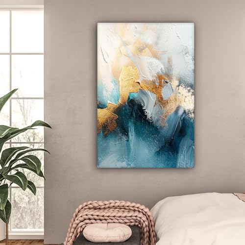 Das MuchoWow© Leinwandbild im großzügigen Format 80x120 cm verleiht jedem Raum ein künstlerisches Flair. Die abstrakte Kunst in einem eleganten Gold-Blau-Farbton bringt einen Hauch von Luxus und Stil in Ihr Schlafzimmer oder Wohnzimmer. Hergestellt aus hochwertigem Canvas, ist diese Wanddekoration ein echter Hingucker.