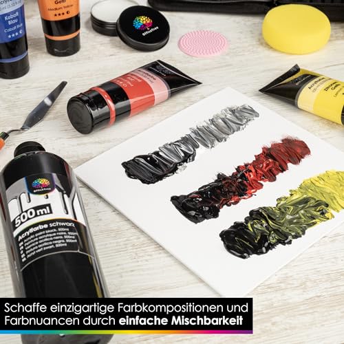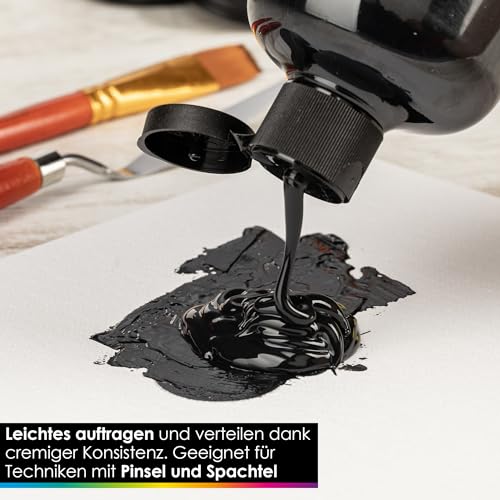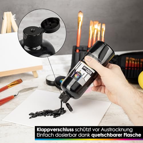 OfficeTree Acrylfarbe Schwarz 500ml - Acrylfarbe Wasserbasis Schwarz- Black Acrylic Paint für Acrylmalerei, Hobbykünstler - Schwarze Acrylfarbe Ideal zum MischenUMFANGREICH - OfficeTree Acrylfarben 500ml Flaschen sind Wiederverschließbar und eignen sich für Hobbykünstler"UNGIFTIG - 500 ml Acrylfarben für Mensch und Umwelt auf Wasserbasis Hergestellt, mit Wasser Verdünnbar, sehr Ergiebig, Cremig Verstreichbar"HOBBY - Schwarze Acrylfarbe 500ml Wasserfest, Lichtecht, schnell Auftrocknend, leicht zu Mischen, Perfekt für Pastosen Farbauftrag"KREATIVSPASS - Für Groß und Klein, Anfänger und Fortgeschrittene, in Uni, Schule, Kindergarten, für Hobbymalerei, DIY, Scrapbooking"BESTÄNDIG - Brillante Leuchtkraft und Lichtbeständigkeit auf Stein, Leinwand, Papier, Holz, Je nach Stoff Unterschiedlich deckend