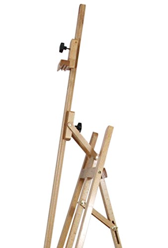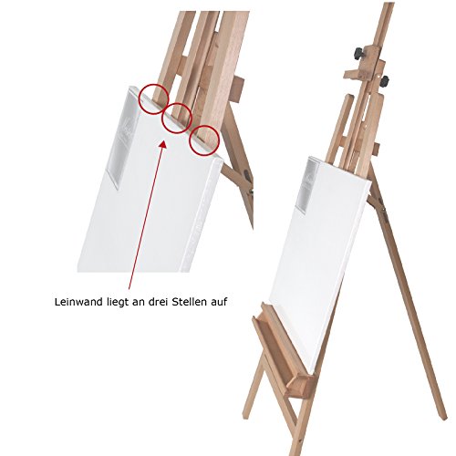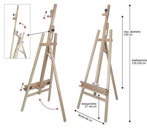 Staffeleien Paintersisters® Akademie Staffelei ELBA, 66x230 cm klappbare Sitz- und Standstaffelei für Keilrahmen bis 120cm, große Studiostaffelei, Dreibeinstaffelei mit breiter Ablage, lasiertes Buchen Holz natur