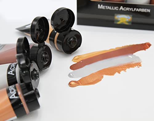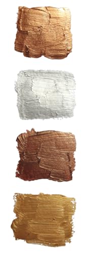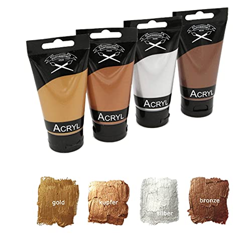 Paintersisters® Metallic Acrylfarben Set 4x 75 ml in Kupfer, gold, silber und bronze, original Magi ARTIST✔ METALLISCH: Die hochwertige Acrylfarbe überzeugt durch eine sehr gute Farbintensität mit beeindruckender metallischer Leuchtkraft und Ausdrucksstärke. Das Set enthält die deckenden Farbtöne Bronze, Gold, Kupfer und Silber."✔ QUALITÄT: Die Metallicfarben sind aus der Magi ARTIST Kollektion und eine hochwertige Künstlerfarbe in Top-Qualität. Sie sind hoch pigmentiert mit einer sehr hohen Farbbrillanz und Lichtechtheit. Die Acrylfarben sind lösungsmittelfrei und speichelecht. Unsere Farben haben sie einen angenehmen Geruch und eine gute Lichtechtheit. Sie sind nach dem Trocknen dauerhaft elastisch und wasserfest."✔ EINFACHE ANWENDUNG: Die gebrauchsfertigen Acrylfarben sind perfekt für Malschulen, den engagierten Künstler und den professionellen Einsatz im Kunsthandwerk. Alle Farben lassen sich untereinander und mit anderen reinen Acrylfarben vermischen, sie sind angenehm im Malverhalten. Unsere Tuben sind luftdicht wiederverschließbar und ermöglichen dadurch eine lange Haltbarkeit. Die verwendeten Pinsel lassen sich einfach mit Wasser reinigen."✔ VIELSEITIG: Die mit Wasser oder speziellem Acrylmalmittel verdünnbaren Acryl Farben eignen sich nicht nur zum Malen auf Leinwand, Malkarton, Papier oder Pappe, sondern auch auf Malplatten, Holz und Spanplatten. Mit unseren Farben können Sie Maltechniken wie Nass-in-Nass, acrylic pouring, fluid painting, fluid art, Acryl Fließtechnik und pastos anwenden."✔ GÜNSTIG: Unser Produzent MAGI fertigt ausschließlich hochwertige Künstlerfarben für diverse Markenhersteller. Und weil wir alles ohne Zwischenhandel direkt vom Hersteller kaufen, erhalten Sie die Künstler-Acrylfarben zu einem extrem günstigen Preis. Mit 4 Farbtönen je 75 ml bekommen sie 300ml metallische Künstlerfarbe und können Ihrer Kreativität freien Lauf lassen.