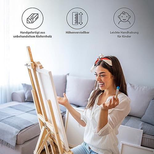 🪵【HOCHWERTIGES KIEFERNHOLZ】– Leinwand Ständer gefertigt aus massivem Kiefernholz für lange Haltbarkeit. Die glatte, splitterfreie Oberfläche bietet ein angenehmes Arbeiten. Aufgrund der Holzverarbeitung können vereinzelt Holzsplitter auftreten. Die natürliche Maserung macht jede Staffelei zu einem Unikat.