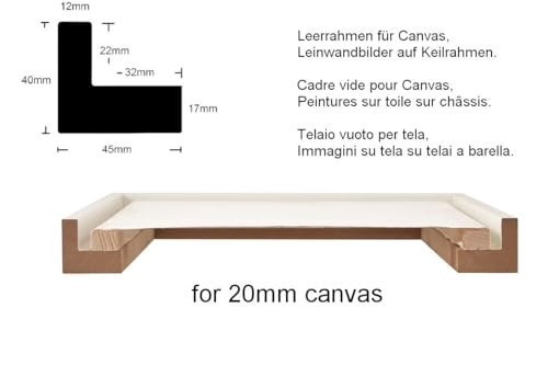 📏 Die Rahmenleiste (Bild 5) hat eine Auflagefläche von 3,2 cm und ist außen 4 cm tief und hat eine sichtbare Stirn von 1,2 cm. Die innere Tiefe von 2,2 cm ist für die allermeisten Leinwände ein Standardmaß und schließt somit bündig ab.