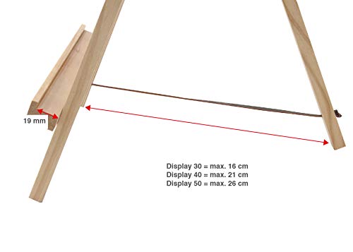 - MAßE: Die Höhe der Staffelei beträgt insgesamt 30 cm, die untere Ablage ist 19 cm breit und 19 mm tief. Vorne an der Ablage befindet sich eine kleine Kante, damit das Bild nicht herunterrutschen kann. Die Höhe von der Ablage bis zur Spitze der Staffelei beträgt 22 cm. Der hintere Fuß ist heranklappbar für ein kleines Verstaumaß, so können Sie auch mehrere Display-Staffeleien ganz einfach verstauen und stapeln.