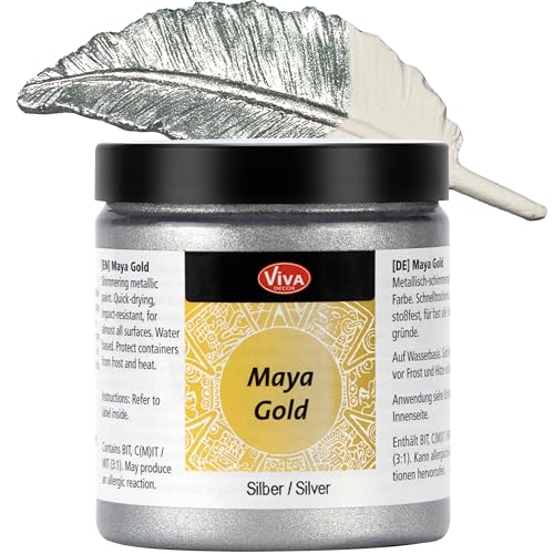 Viva Decor Maya Gold 250ml (Silber) - Metallic-Acrylfarbe für kreative Werke auf Holz, Glas und Porzellan. Stoßfest, wischfest und wetterfest für glänzende Metall- / Metallic EffekteVielfältige Farbpalette: Maya-Gold präsentiert 30 beeindruckende metallisch-schimmernde Farbtönen, darunter Blau, Gold und Silber. Jeder Farbton verleiht deinem Projekt eine einzigartige Intensität und Brillanz."Echter Metallglanz: Die Metallic Farbe von Maya-Gold verleiht deinen Projekten einen authentischen und strahlenden Metallglanz, der sich von herkömmlichen Farben abhebt."Hochwertige Acrylfarbe: Als Acrylfarbe bietet Maya-Gold nicht nur eine beeindruckende Deckkraft, sondern auch eine schnelle Trocknungszeit und eine lange Haltbarkeit."Einfache Anwendung: Mit einem Flachpinsel oder Tupf-Schwamm in zwei Schritten auftragen - zuerst dünn und dann deckend. So entsteht ein gleichmäßiger und strukturierter Farbauftrag, der beeindruckt."Vielseitig einsetzbar: Maya-Gold eignet sich perfekt für eine Vielzahl von Untergründen, von saugenden Materialien wie Holz und Terrakotta bis hin zu nicht saugenden Oberflächen wie Glas, Porzellan und Kunststoff.